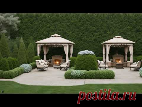 На изображении виден ухоженный сад с двумя павильонами, оборудованными местами для сидения и камином. Растения аккуратно обрезаны и создают геометрические формы, подчеркивающие симметрию и ландшафтный дизайн.