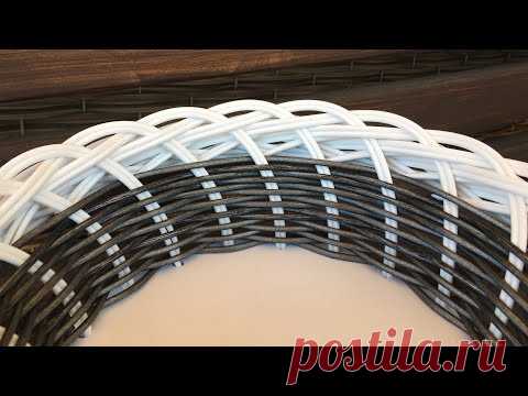 Крупный план части плетеной корзины, выполненной из белых и черных полос материала, вероятно, пластика или ротанга.