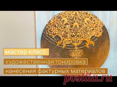 На изображении представлена круглая декоративная тарелка с рельефным узором на стене. Также на картинке есть текст, который анонсирует мастер-класс по художественной тонировке и нанесению фактурных материалов.