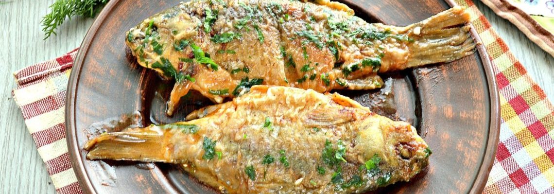 На изображении представлена приготовленная рыба на тарелке, украшенная зеленью. Рыба выглядит поджаренной и аппетитной, сервирована на темной тарелке с линеной салфеткой в клетку на столе.