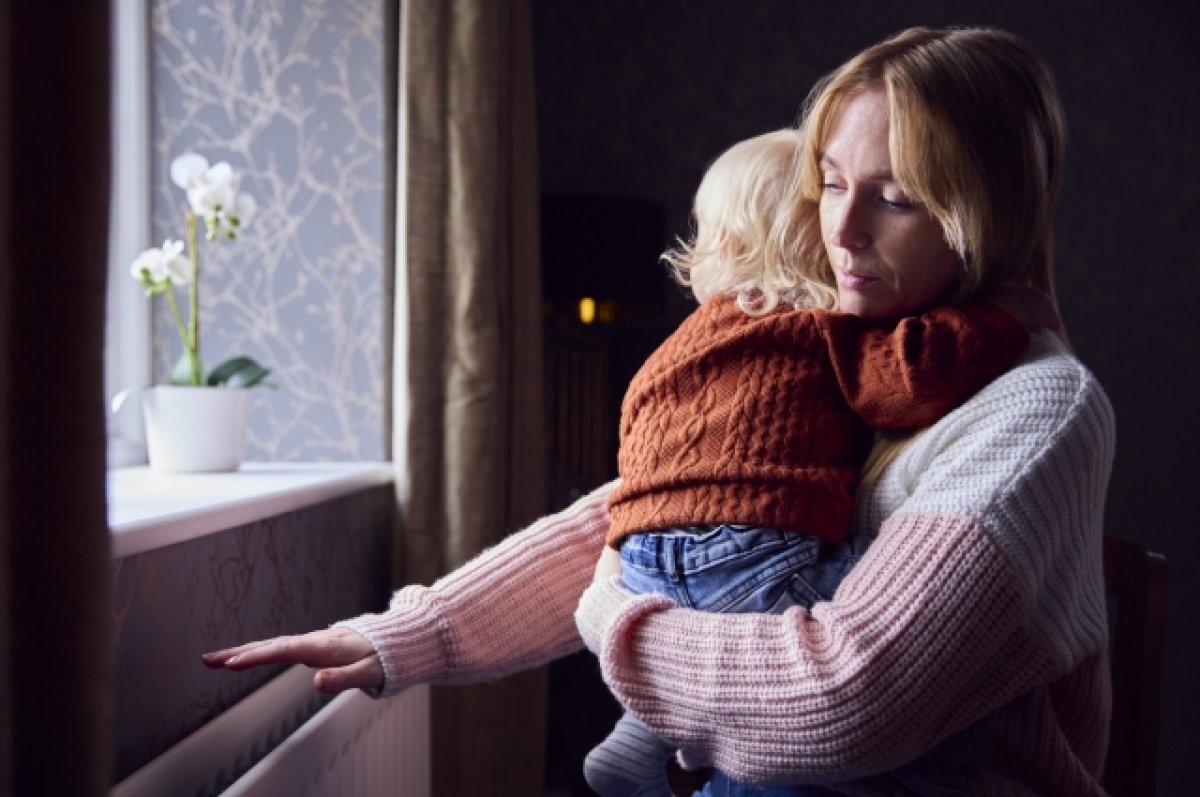 Женщина обнимает маленького ребенка, смотрящего в окно. Они находятся в комнате с уютной обстановкой. На подоконнике виден цветок в горшке.