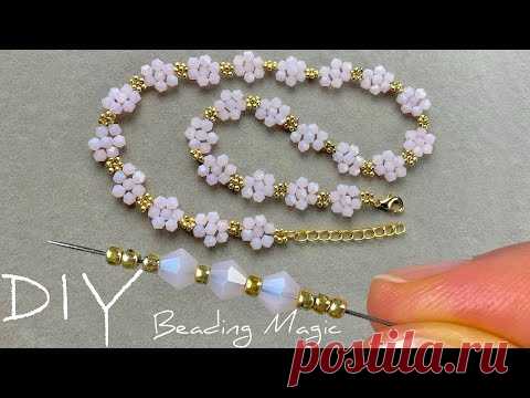 На изображении представлено рукодельное украшение в виде ожерелья с бело-розовыми цветочными элементами и золотистыми бусинами. Также на фотографии видна рука человека, удерживающая иглу с бусиной, и текст "DIY Beading Magic positiva.ru", указывающий на то, что это изображение может быть из учебного материала или инструкции по изготовлению украшений своими руками.