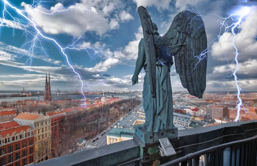 На изображении памятник ангела на фоне городского пейзажа с видом на крыши зданий и молнии в небе. Надпись на изображении "postila.ru" указывает на источник изображения.