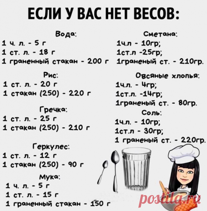 Изображение с таблицей замен мер веса продуктов на объемные меры: вода, сметана, рис, овсяные хлопья, гречка, соль, крупы, мука. Внизу изображен рисунок женщины в поварском колпаке.
