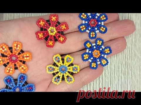 На изображении представлены цветы, сделанные из бисера, лежащие на ладони. Они имеют различные цветовые сочетания и размеры, представляя собой ручную работу.