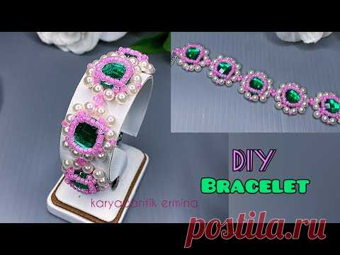 На изображении представлены украшения, сделанные своими руками – браслет. Браслет украшен розовыми и зелёными камнями. Также на изображении есть слова "DIY BRACELET" и веб-адрес.