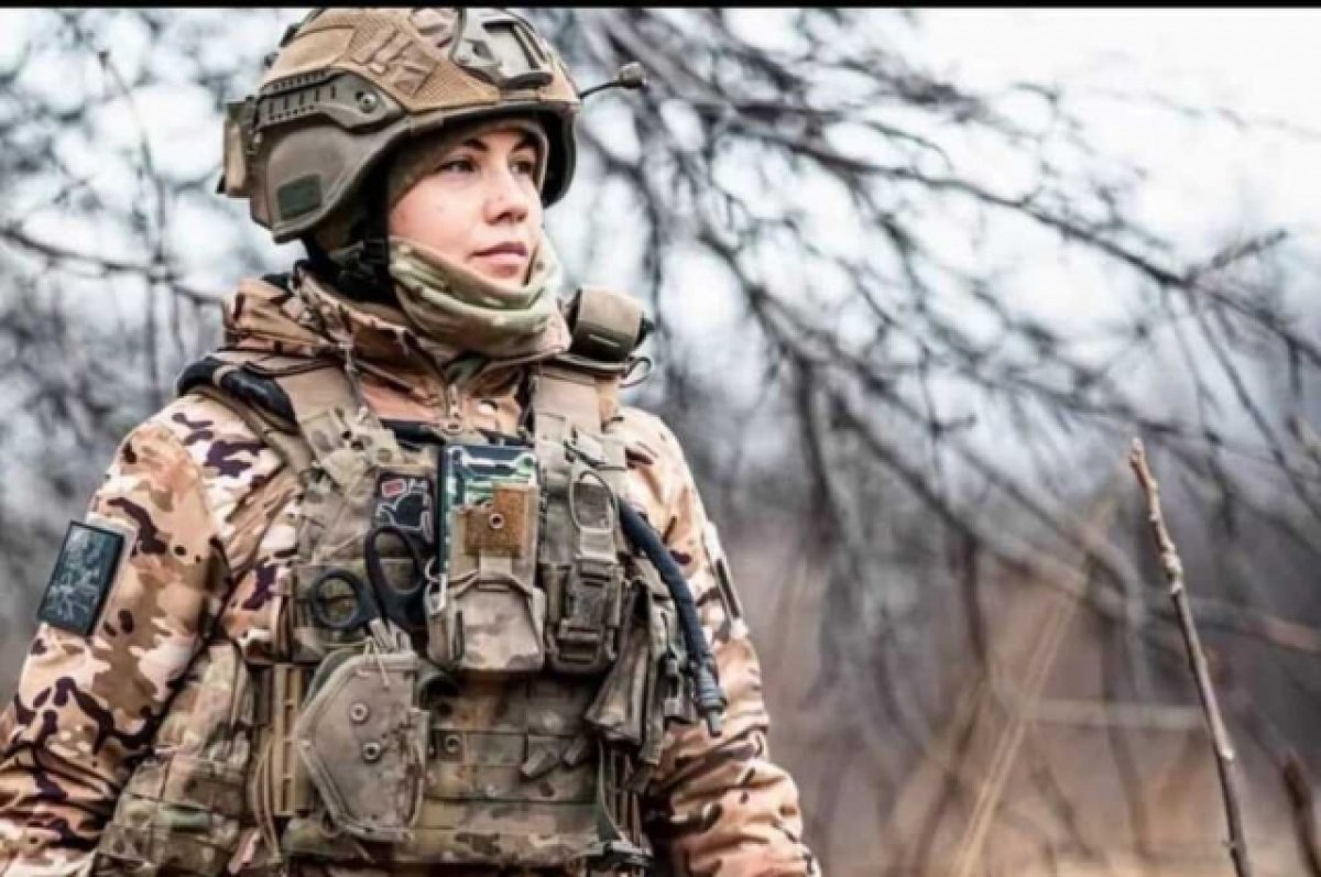 На изображении видна женщина в военной униформе, на ней шлем и бронежилет. Она стоит на фоне природного ландшафта, выглядит серьезно и сосредоточенно.