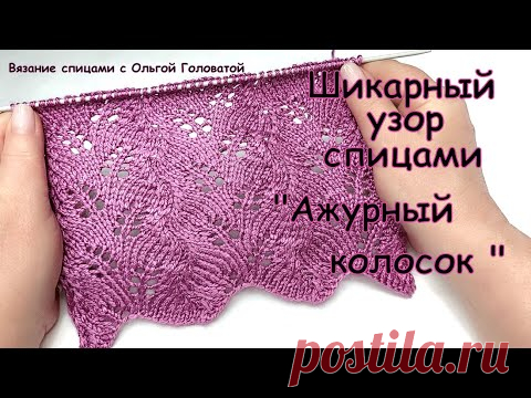 Ручное вязание, кружевной узор на фиолетовом вязаном изделии, который демонстрируется на фоне белого вязания.