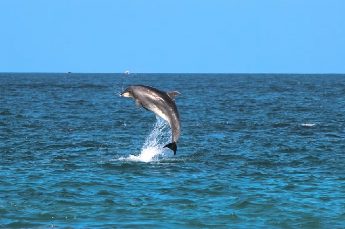 Дельфин выпрыгивает из воды на фоне голубого неба