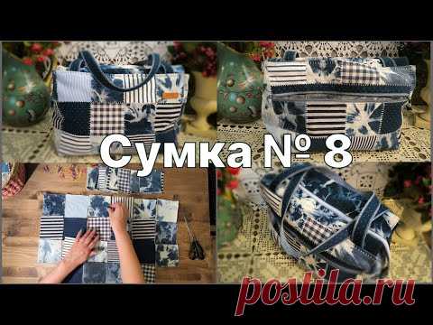 На изображении представлен набор изделий из ткани. В верхней части - сумка с ручками и передним карманом, выполненная в пэчворк-стиле из различных видов клетчатой ткани. Внизу - фотография процесса создания сумки: руки человека собирают кусочки ткани в пэчворк. В нижнем правом углу изображена готовая небольшая пэчворковая сумка. Текст на изображении гласит "Сумка №8" и ссылается на источник "postila.ru".