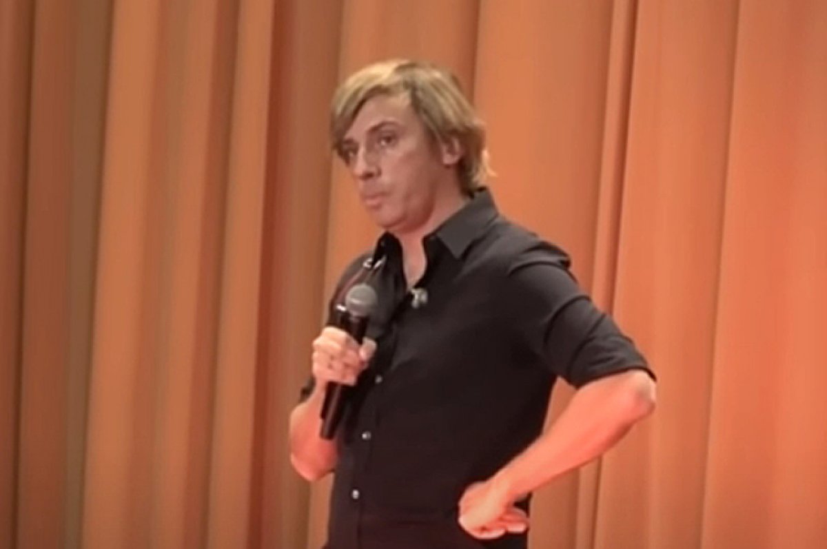 На изображении мужчина с микрофоном в руке стоит на сцене перед аудиторией. Он одет в темную рубашку и выглядит так, будто выступает или рассказывает историю.
