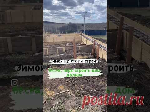 На изображении строительная площадка с несооруженными конструкциями и зданием вдали. На переднем плане видны деревянные брусья и опалубка, предположительно для заливки фундамента. Небо облачное, что может указывать на нестабильную погоду. Изображение содержит текст на русском языке с фразами "зимой не стали строить" и "весной начали строить дом ещё дальше", отображающие возможно постоянное или шутливое сообщение о строительстве.