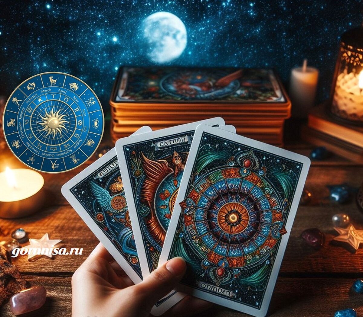 На изображении видны чьи-то руки, держащие колоду таро на фоне загадочной комнаты с магической атмосферой. На заднем плане расположены свечи, книги, астрологическая карта и изображение луны в ночном небе.