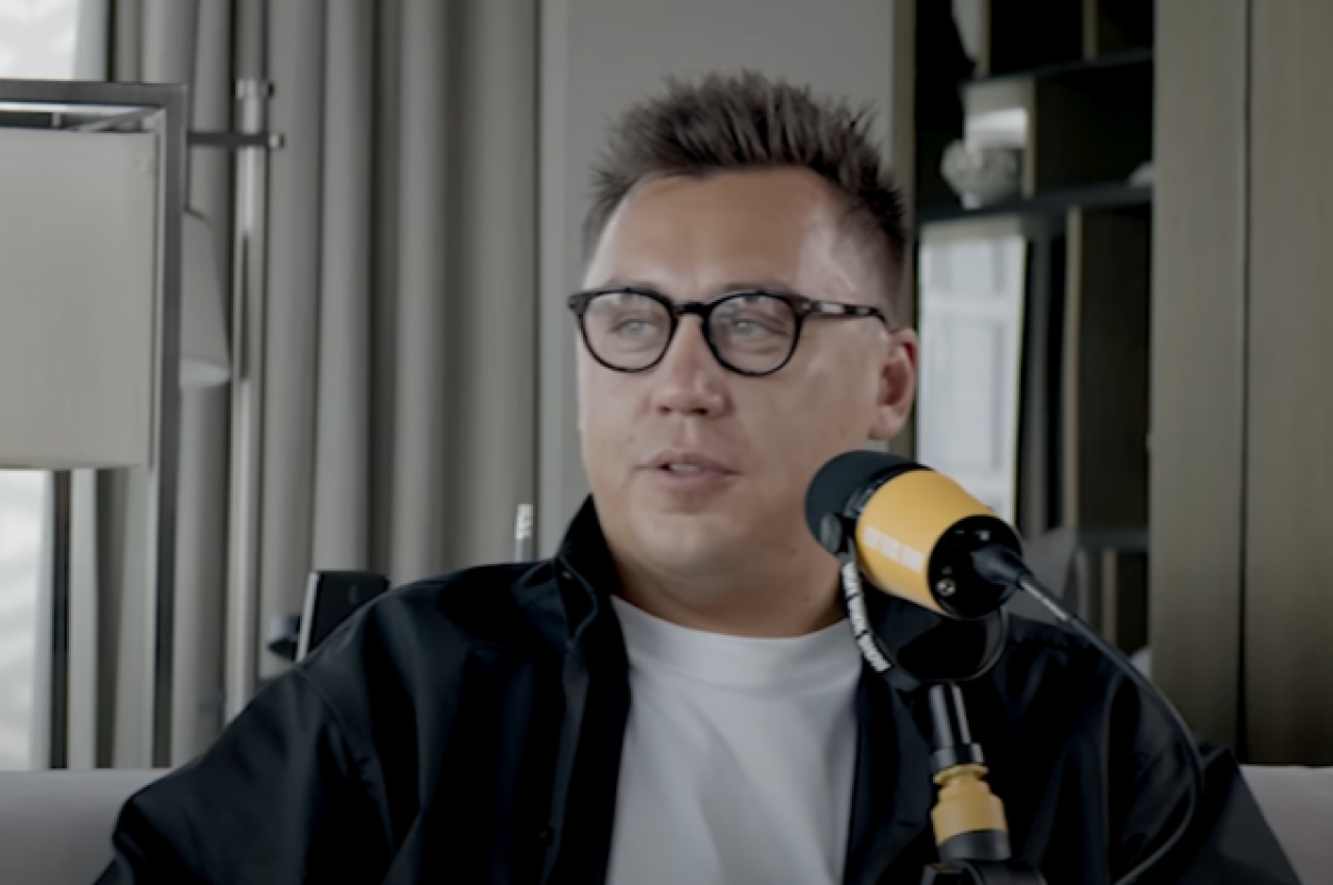 На изображении мужчина в очках, который выглядит как участник интервью или подкаста. Перед ним на столе стоит микрофон с логотипом. Он находится в комнате с современным интерьером, на заднем фоне видно окно и часть помещения.