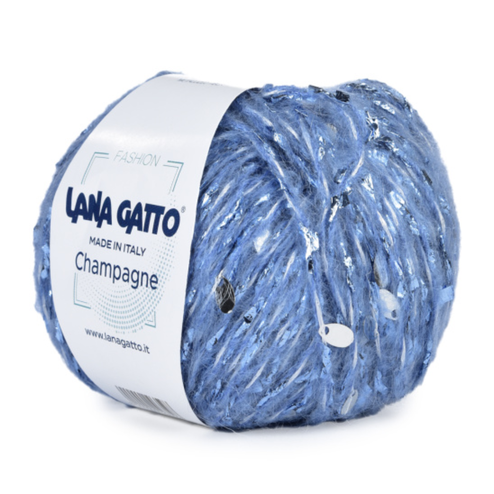 Новелок пряжи синего цвета с металлическим блеском и биркой, на которой написано "Lana Gatto", "Made in Italy" и "Champagne".