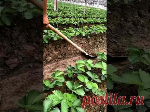 На изображении виден огород с растущей клубникой. Кто-то с помощью садового инструмента - мотыги, пропалывает грядки. Почва влажная и рыхлая, что свидетельствует о недавнем поливе или дожде.