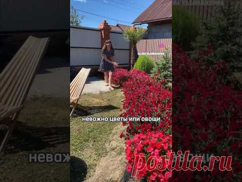 На фото изображен участок сада с женщиной в центре кадра. Женщина стоит среди ярко-красных цветущих кустов, возможно, это розы или другие цветущие растения. Сад выглядит ухоженным, с зеленым газоном и деревянными лежаками в левой части кадра. На заднем плане виден забор и хозяйственные постройки.