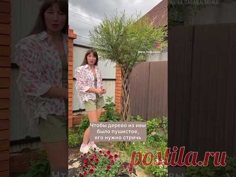 На изображении женщина стоит в саду рядом с деревом. Она одета в рубашку с цветочным принтом и короткие шорты. Вокруг неё видны кусты и цветы. На заднем плане расположены дом и забор. Изображение похоже на кадр из какого-то видеоролика с текстом на русском языке.