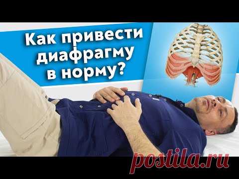На изображении мужчина ложится на спину с поднятыми вверх и согнутыми в коленях ногами, руки на животе, что предполагает демонстрацию упражнения для диафрагмы. Над ним размещен текст: "Как привести диафрагму в норму?" и изображение диафрагмы человеческого тела справа вверху.