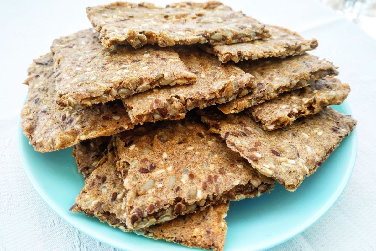 На изображении показана куча хлебцев, сложенных на голубой тарелке. Хлебцы имеют зернистую текстуру и выглядят хрустящими и здоровыми.