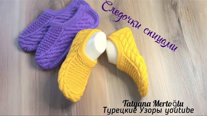 Вязаные тапочки с косами 💛💜 вяжем спицами