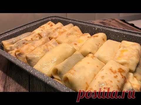 На фотографии представлен противень с запеченными блинчиками, которые могут быть начинены мясом, творогом или другой начинкой. Блюдо выглядит аппетитно и готово к подаче.