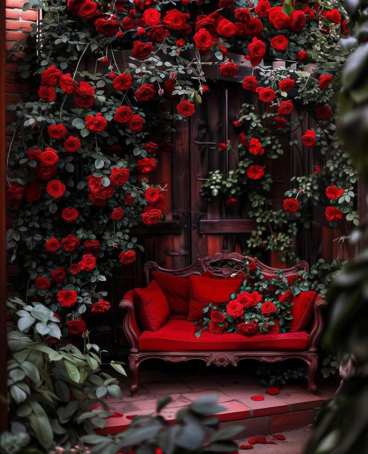 На изображении красный винтажный диван, размещенный на фоне темной двери, украшенной густыми зарослями красных роз. Цветущие розы придают сцене романтическую и сказочную атмосферу.