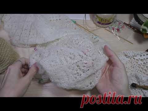На изображении видны руки человека, держащие кружево или вязаное изделие. Вокруг разбросаны другие кусочки кружева, иголки и нитки, что указывает на рукоделие.