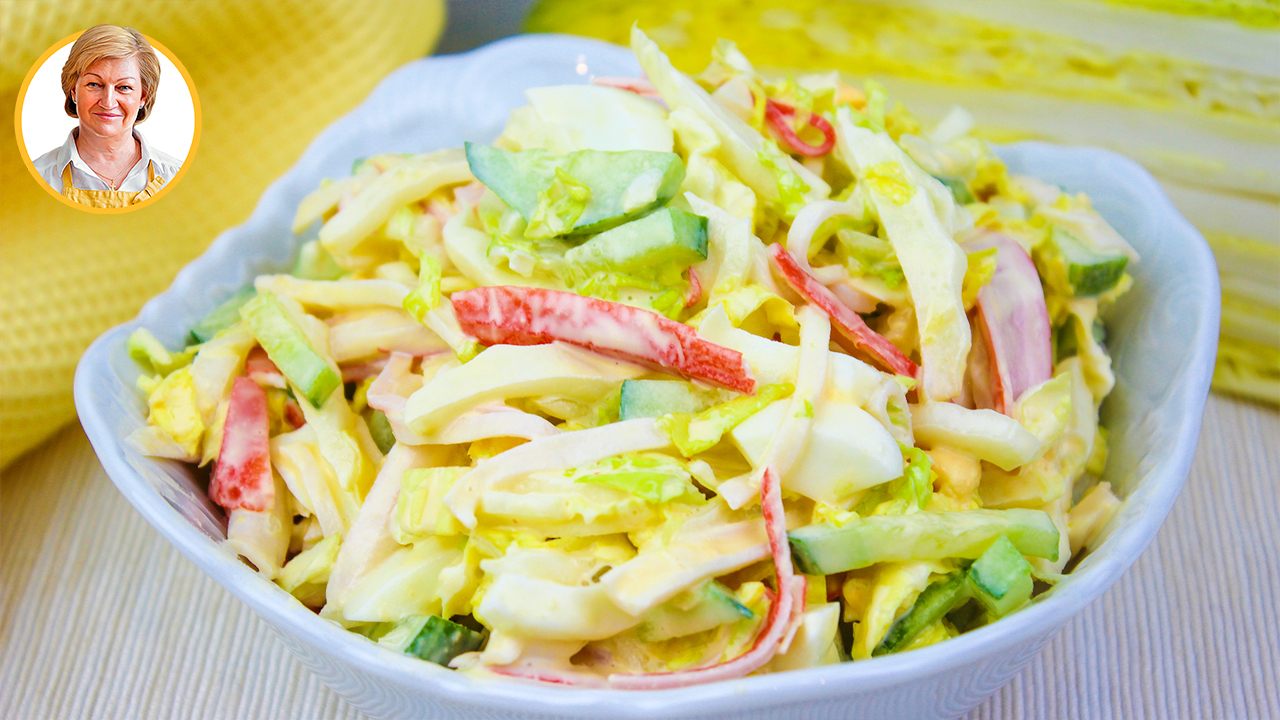 Салат с пекинской капустой, крабовыми палочками, огурцом и яйцами