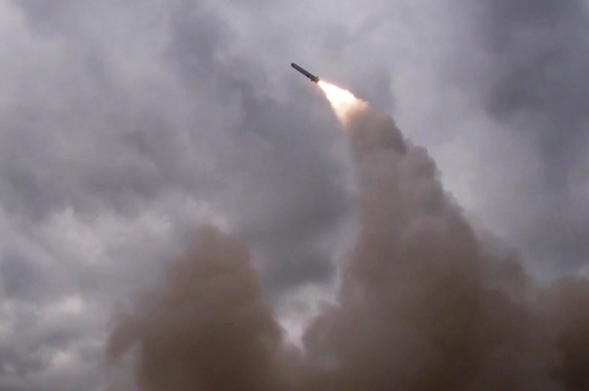 На изображении запуск ракеты на фоне облачного неба. Ракета продвигается вверх, оставляя за собой след из дыма и выхлопных газов.