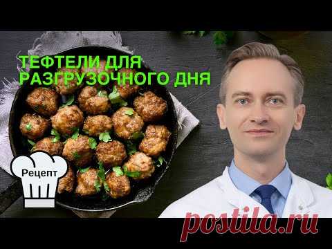 На изображении представлен мужчина в белом медицинском халате, на фоне изображены котлеты, украшенные зеленью в черной сковороде. Вверху изображения надпись "Тефтели для разгрузочного дня" и иконка белого поварского колпака с подписью "Рецепт". Видимо указывает на то, что эти тефтели являются частью диетического или здорового меню. Домен "positivа.ru" в указан в нижнем правом углу.