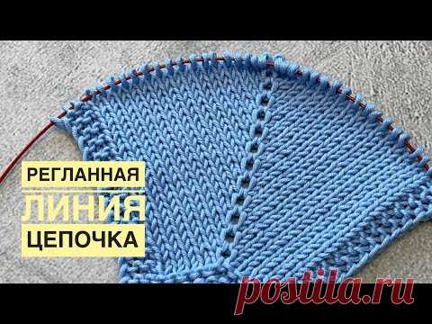 Вязаная деталь из синей пряжи, возможно, элемент шапки или часть одежды, с вязкой выполненной спицами. На изображении также присутствует текст на русском языке: "РЕГУЛЯРНАЯ ЛИНИЯ ЦЕПОЧКА" и логотип "postila.ru".