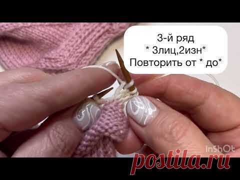 Человек вяжет спицами розовую ткань. На картинке есть текст с указаниями для вязания.