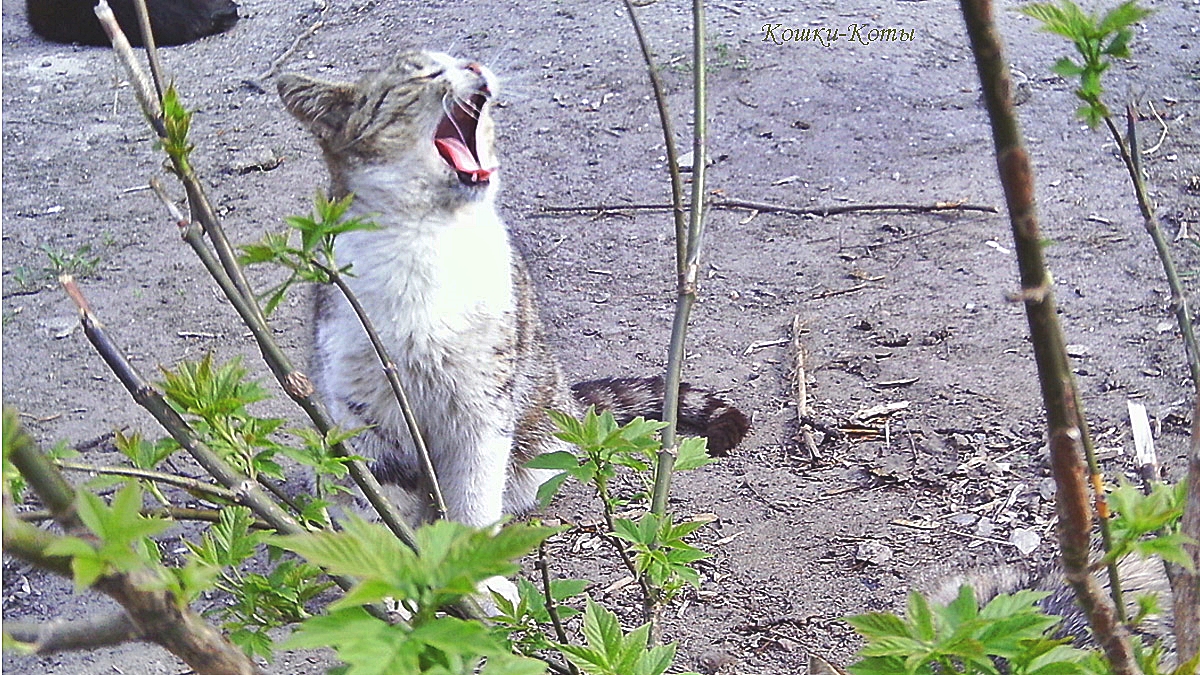 Кот сидит на земле с открытым ртом, кажется, он зевает. Вокруг него видны растения, и это похоже на садовый или природный ландшафт.