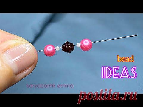 На изображении показана рука человека, держащего булавку с нанизанными бусинами. В центре расположена коричневая бусина в форме куба, окруженная розовыми бусинами. В верхнем правом углу присутствует текст "bead IDEAS". Фон изображения - однотонный синий.