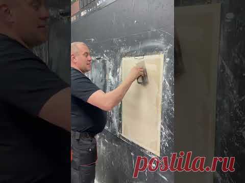 На изображении видно, как мужчина работает с шпателем и наносит штукатурку или шпаклевку на стену. Он носит черную футболку и кажется, что он находится на строительном объекте или в процессе ремонта.