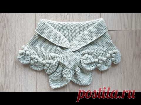 На изображении представлен связанный крючком или спицами женский вязаный палантин серого цвета с украшениями в виде вязаных цветов. Изделие лежит на светлом деревянном полу.