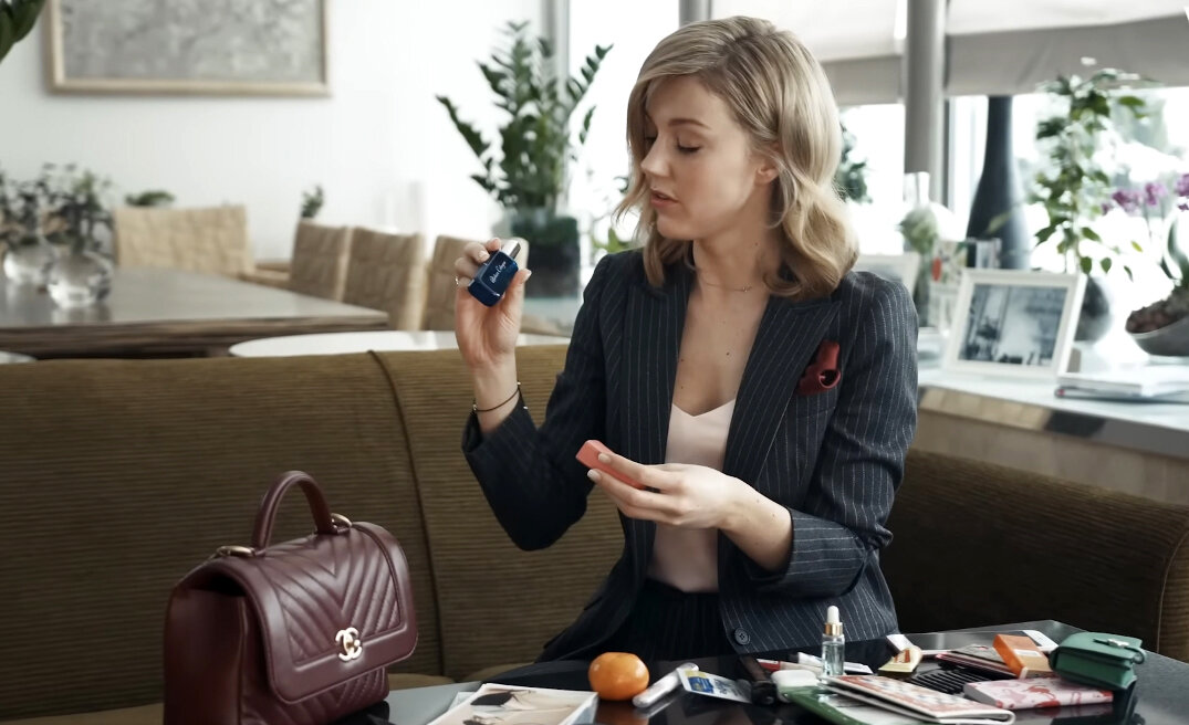 На изображении женщина сидит на диване и держит в руке какой-то предмет, возможно, бутылочку с лекарством или косметическое средство. Она похоже внимательно изучает этот предмет. Рядом с ней на столе лежит женская сумочка, а также видны различные предметы, такие как фрукты и журналы.
