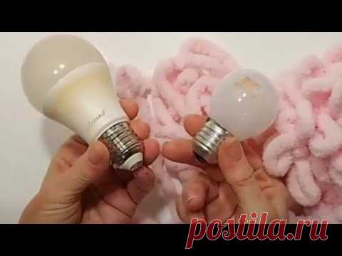 На фотографии изображены две руки, держащие две разных по размеру лампочки на фоне розового мягкого предмета, возможно, это плед или вязаный элемент. Большая лампочка выглядит как светодиодная, а меньшая как обычная лампа накаливания.