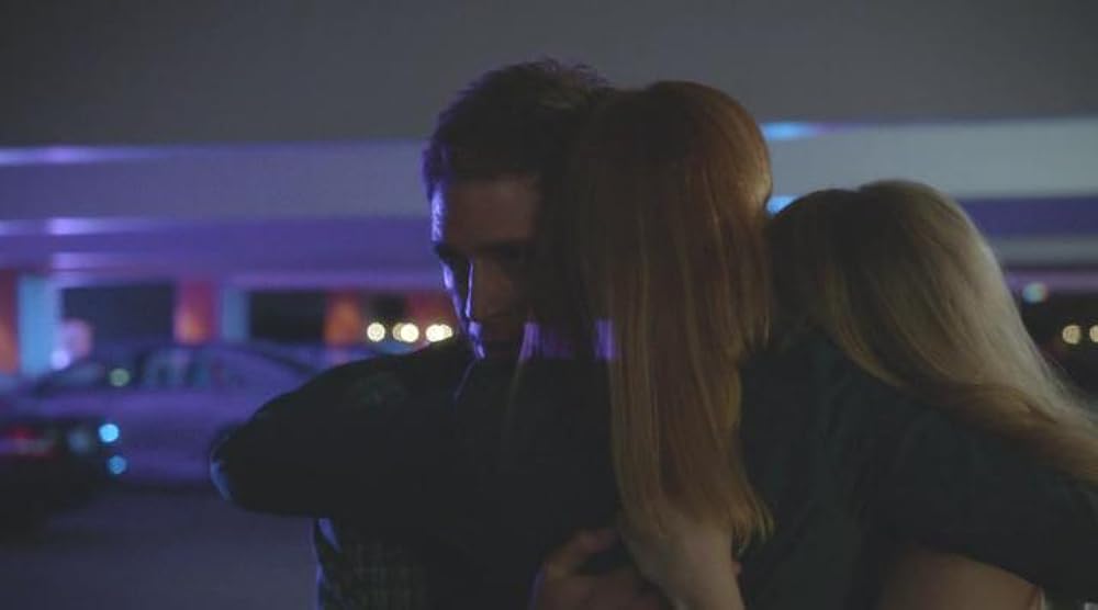 На изображении видны два человека, обнимающиеся в вечернее время. Освещение невысокое и кажется, что они находятся на парковке. Их лица не видны, так как они повернуты друг к другу спинами к камере.