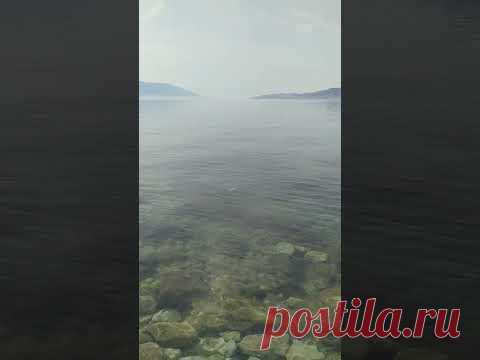 На фотографии изображен спокойный водоём, возможно озеро или залив. Видно, что вода достаточно чистая, так как можно разглядеть камни на дне. Горизонт простирается в даль, подчеркивая широкий масштаб пейзажа. Вдали наблюдаются слабо очерченные очертания гор или холмов, покрытых растительностью или лесом.