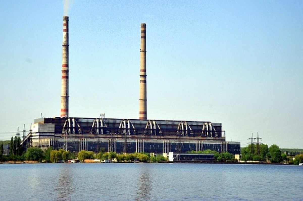 На изображении представлена тепловая электростанция на берегу водоёма. Высокие дымовые трубы выпускают дым в небо, олицетворяя промышленную активность.