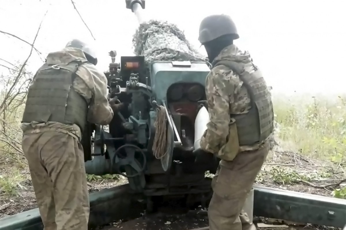 Двое военнослужащих в камуфляжной форме обслуживают артиллерийскую пушку на открытой местности.