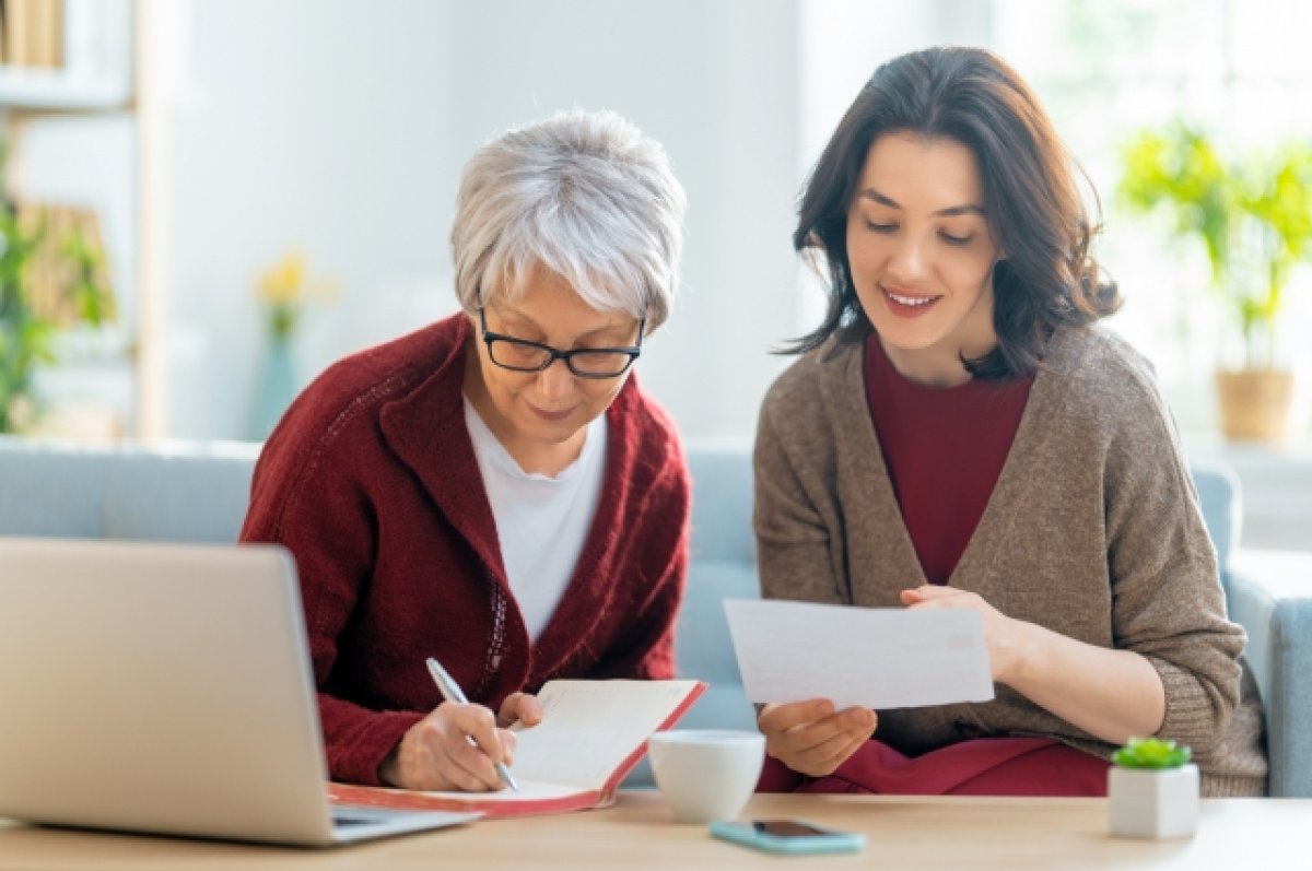На изображении две женщины сидят за столом, возможно работают с документами. Одна из них, пожилого возраста, сидит слева и пишет что-то в тетрадь, в то время как младшая женщина стоит справа и держит в руках бумаги. На заднем плане расположен ноутбук.