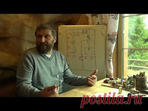 На фотографии изображен мужчина, сидящий за столом в комнате. Он держит какой-то предмет в правой руке и указывает на доску с различными маркировками или схемой, расположенную позади него. Вокруг расставлены различные мелкие предметы, похожие на компоненты для электроники или другие мастерские инструменты. Окружение предполагает, что человек на фотографии возможно занимается объяснением или обучением, связанным с электроникой или электросхемами.