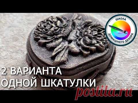 Изображение демонстрирует объект, похожий на шоколадное печенье или украшение, выполненное в темных тонах с рельефным узором цветов. На фоне видна текстурированная поверхность. В верхнем углу присутствует логотип "ШКОЛА ДОМАШНЕГО ДЕКОРА", а ниже текст "2 варианта одной шкатулки".