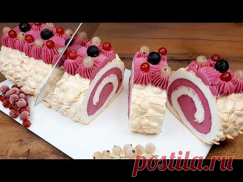 На изображении изображен бисквитный рулет, украшенный свежими ягодами и взбитыми сливками. Десерт разрезан, чтобы показать его слои и начинку.