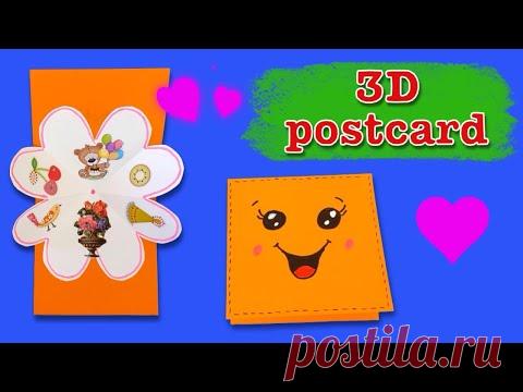 На изображении представлены две ручной работы открытки с элементами 3D. Одна открытка имеет форму цветка и украшена фигурками, а вторая выполнена в виде смайлика. Фон изображения синего и зеленого цвета с сердечками и надписью "3D postcard".