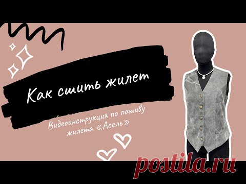 Изображение с текстом "Как сшить жилет" и манекеном, одетым в жилет на фоне с элементами дизайна, включая сердечки и звездочки. Также имеется ссылка на веб-сайт "posila.ru"