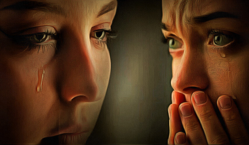 На изображении представлены два лица человека, возможно, одного и того же персонажа в разных ракурсах, оба с выразительными грустными глазами и слезами. Один образ лица крупно показывает слезу, скатывающуюся по щеке. Другой образ лица демонстрирует человека, прикрывающего рот рукой, словно пытается сдержать эмоции. В целом, изображение передает глубокие эмоциональные переживания и печаль.